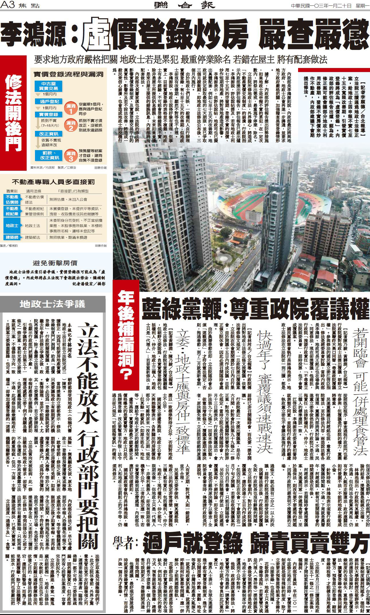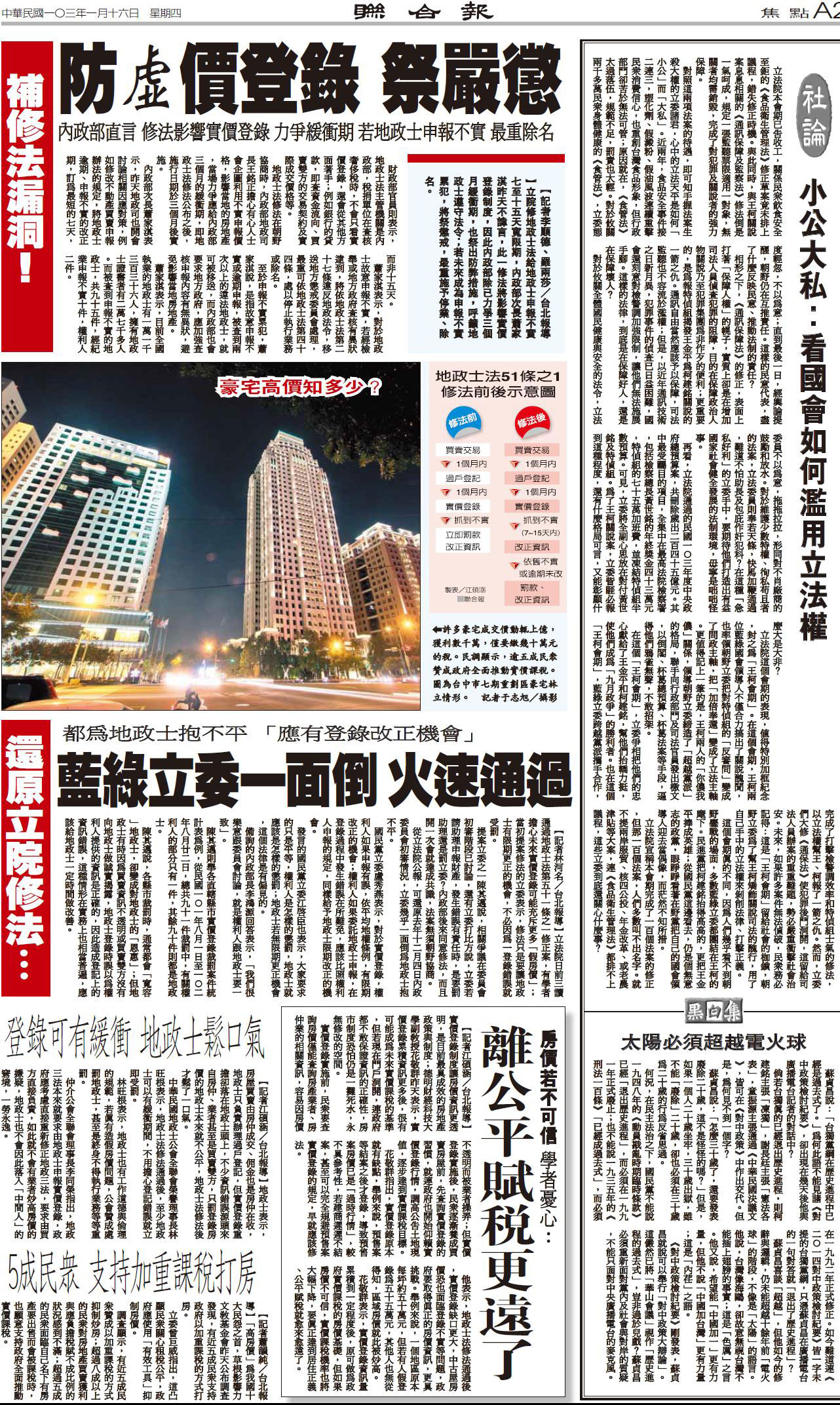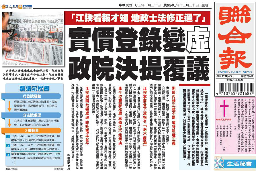 本系列報導開風氣之先,獨家報導由朝野立委聯合通過的《地政士法》修正案,揭露此一法律修正案將導致房價實價登錄政策徒具形式,高房價問題無法受到合理節制。該報並給予頭版頭條的顯著位置,引起行政院注意並對此依法律修正案提出覆議,終結了這項朝野立委各懷鬼胎護航通過的法律修正案,厥為新聞媒體通過即時報導而守護公共利益的最佳示範。