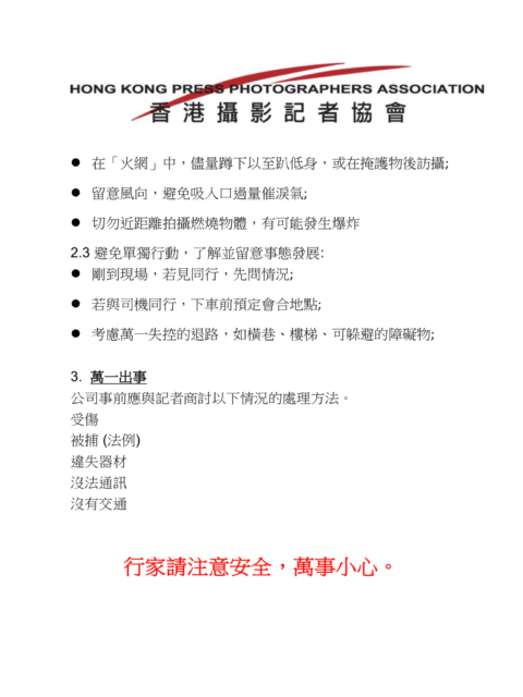 註一:自保方法除了參考香港攝影記者協會的建議之外,也有建議單兵作戰者可適時靠近團體行動之傳媒確保安全。