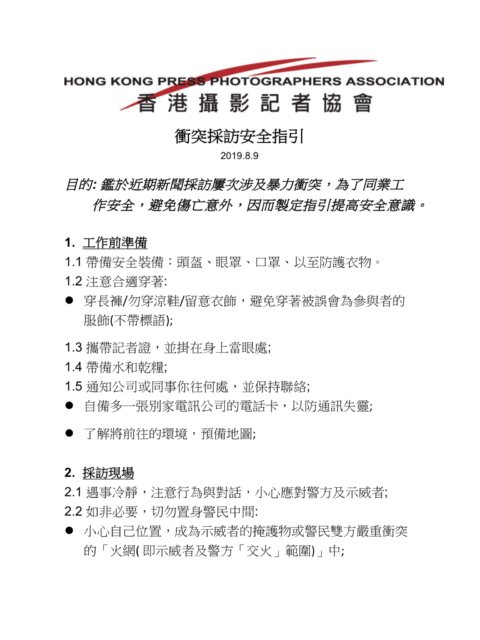 香港攝影記者協會已於日前公布「衝突採訪安全指引」,結合曾經參與612報導的中央社記者王飛華與公視新聞特約記者梁駿樂的經驗,與運動參與者整理出的指示,即使客機因機場封閉而暫時停飛、物資也受到嚴格監控,這幾日局勢尚有可能變動,可參考的建議細節增補如下:
