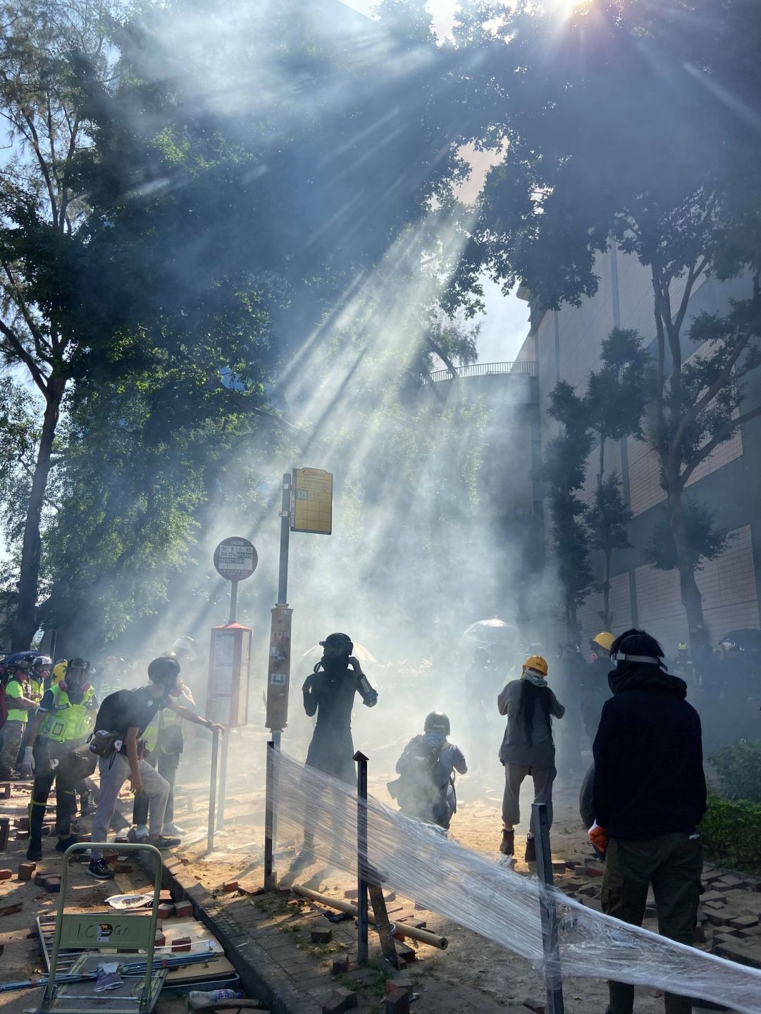 催淚彈的煙霧彈瀰漫,在陽光照射下,竟形成一種唯美的畫面。這張照片也是林靜梅與同事們得獎作品《「荒日下煙硝四起」記香港理工大學抗爭》系列報導命名的由來。圖:林靜梅提供